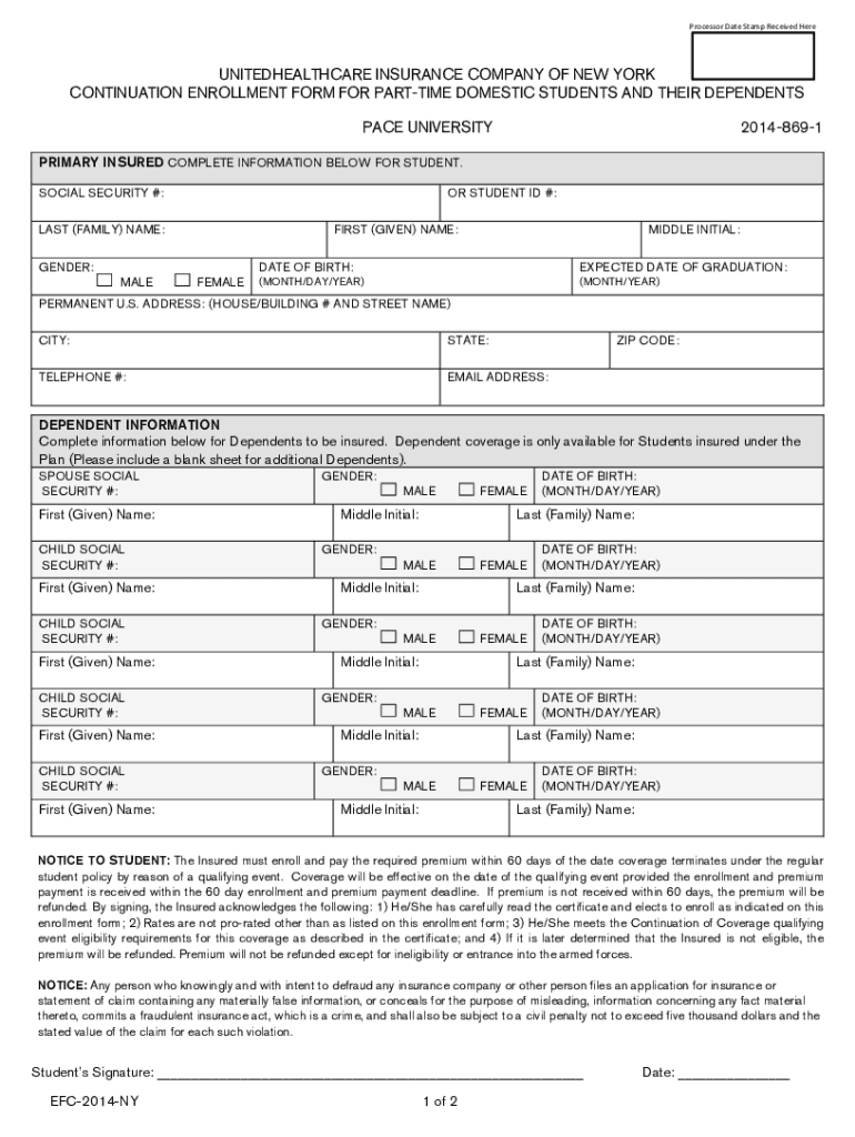 Processor Date Stamp Received HereUNITEDHEALTHCARE INSURANCE COMPANY OF NEW YORK CONTINUATION ENROLLMENT FORM FOR PART TIME DOMESTIC STUDENTS AND THEIR DEPENDENTS PACE UNIVERSITY20148691PRIMARY INSURED