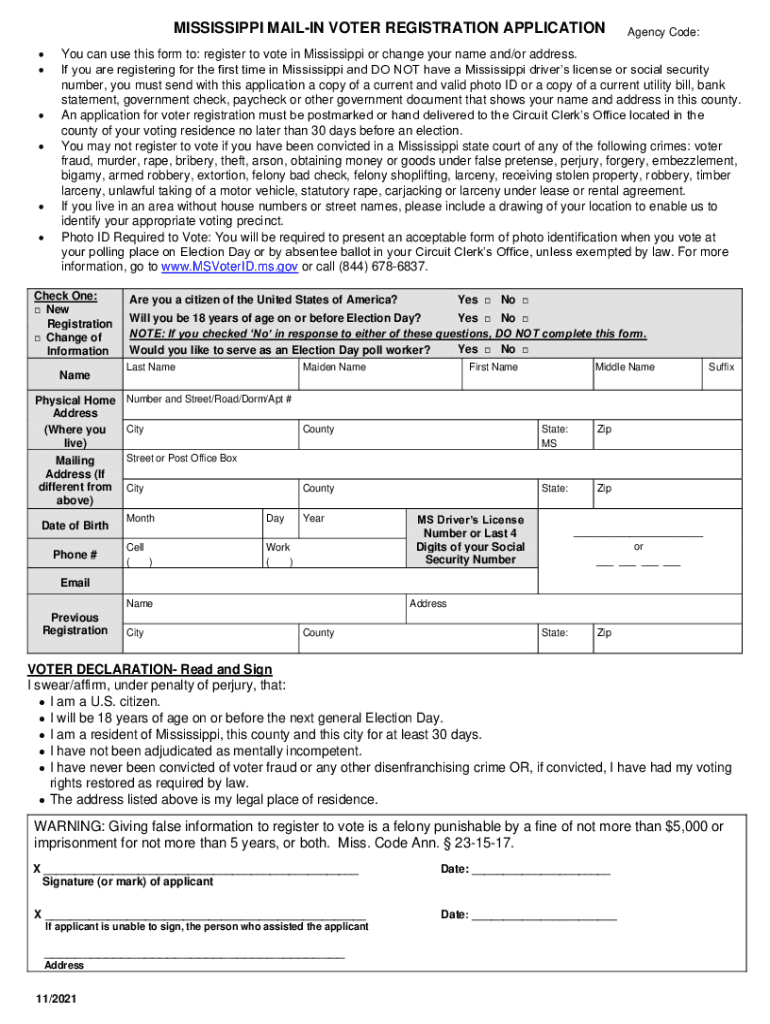 MISSISSIPPI MAILING VOTER REGISTRATION APPLICATION Agency Code:You can use this form to: register to vote in Mississippi or change your name and×or address. If you are registering for the first time