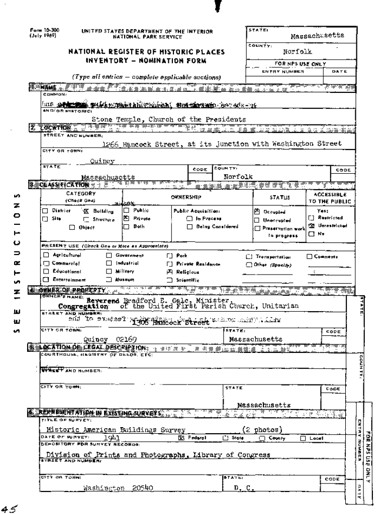 Form 10300 (July 1969×UNITED STATES DEPARTMENT OF THE INTERIOR NATIONAL PARK SERVICE Massachusetts COUNTY:NorfolkNATIONAL REGISTER OF HISTORIC PLACES INVENTORY NOMINATION FORMFORNPS USE ONLY ENTRY