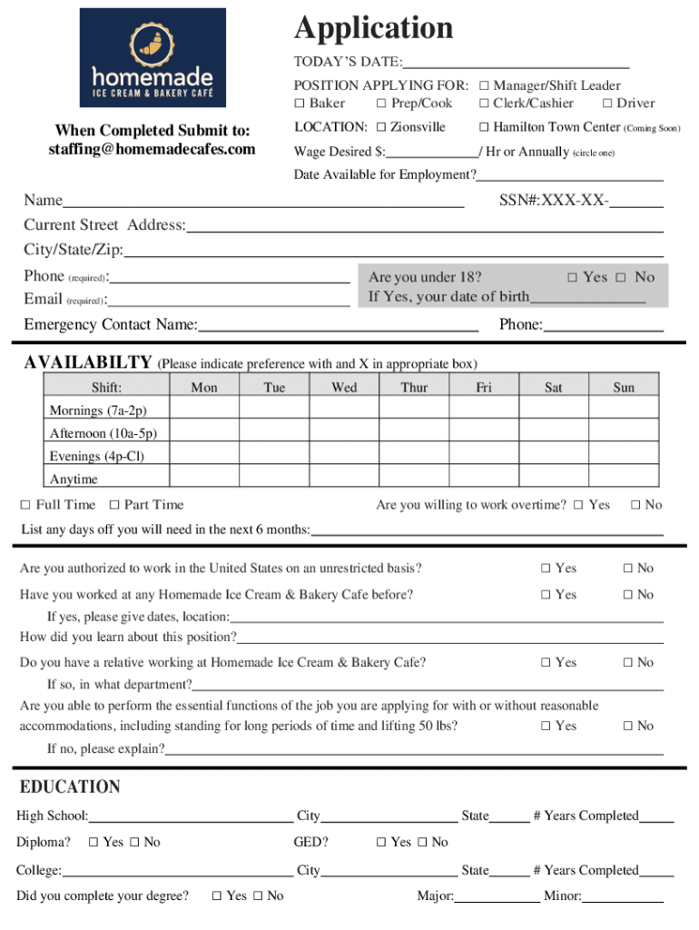 Application TODAYS DATE: Manager×Shift Leader Clerk×Cashier Driver Hamilton Town Center (Coming Soon×POSITION APPLYING FOR: Baker Prep×Cook LOCATION:When Completed Submit to: staffing×homemadecafes.com