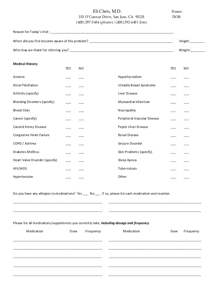 Eli Chen, M.D. 333 O'Connor Drive, San Jose, CA 95128 ×408× 2973484 (phone) / (408× 2926481 (fax×Name: DOB:Reason for Today's Visit: ___ When did you first become aware of this problem? ___Height:___Who