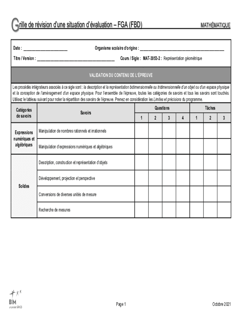 Grille DE vision dune situation evaluation FFA (FBI) Date : ___MATHMATIQUEOrganisme Claire origin : ___Title / Version : ___Course / SIGLE : MAT30532 : Representation gomtriqueVALIDATION DU CONTENT