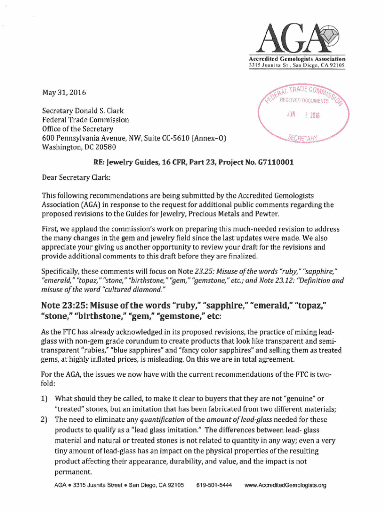 AGAccrrditrd Gemologists Association 33 15 Juvenile St. San Diego. C/ 92105May 31, 2016 Secretary Donald S. Clark Federal Trade Commission Office of the Secretary 600 Pennsylvania Avenue, NW, Suite