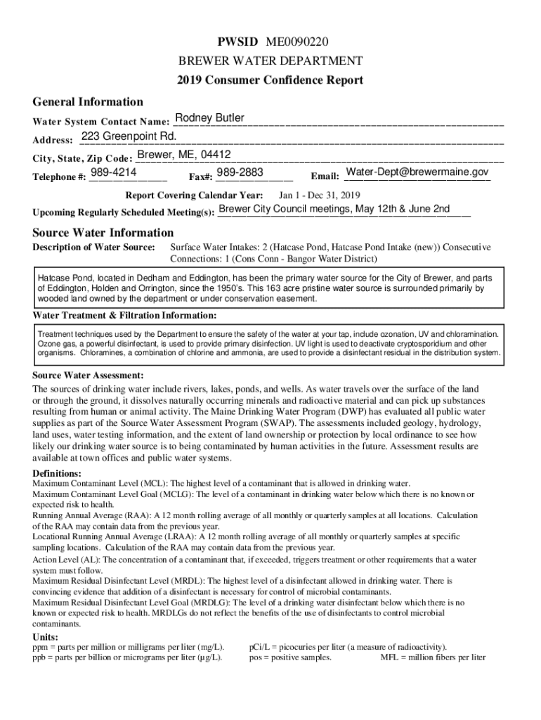 PW SID ME0090220 BREWER WATER DEPARTMENT 2019 Consumer Confidence Report General Information Rodney Butler Water System Contact Name: ___ 223 Green point Rd. Address: ___Brewer, ME, 04412 City, State,