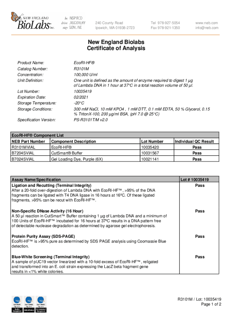 240 County Road Ipswich, MA 019382723Tel 9789275054 Fax 9789211350www.neb.com info×Neb.come England Biol abs Certificate of Analysis Product Name: Catalog Number: Concentration: Unit Definition: