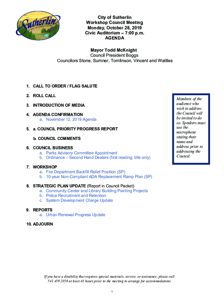 City of Sutherland Workshop Council Meeting Monday, October 28, 2019, Civic Auditorium 7:00 p.m. AGENDA Mayor Todd McKnight Council President Boggs Councilors Stone, Sumner, Tomlinson, Vincent and