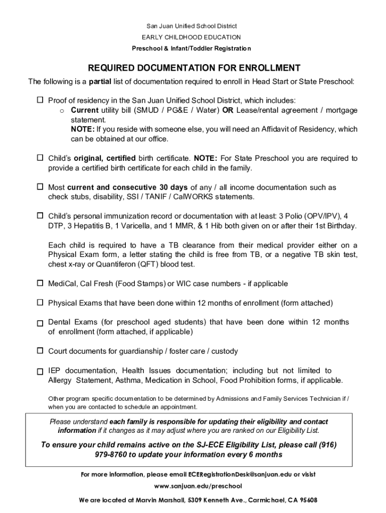 San Juan Unified School District EARLY CHILDHOOD EDUCATION Preschool & Infant×Toddler RegistrationREQUIRED DOCUMENTATION FOR ENROLLMENT The following is a partial list of documentation required to