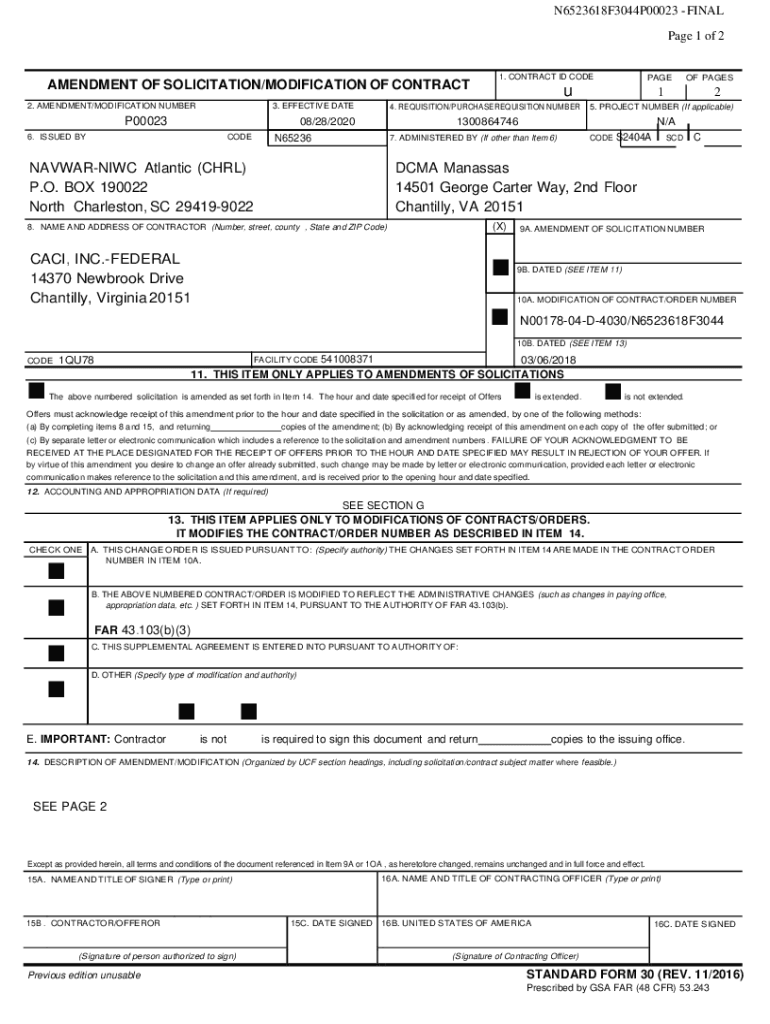 N6523618F3044P00023 FINAL Page 1 of 2AMENDMENT OF SOLICITATION×MODIFICATION OF CONTRACT 2. AMENDMENT×MODIFICATION NUMBER3. EFFECTIVE DATEP00023 CODEPAGEu4. REQUISITION×PURCHASEREQUISITION NUMBER08×28×20206.