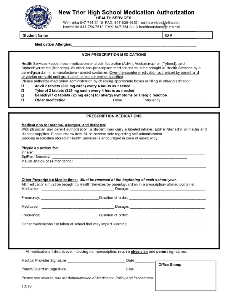 New Trier High School Medication Authorization HEALTH SERVICES Winnetka 8477842110 FAX: 8478359852 health services×NHS.net Northfield 8477847513 FAX: 8477843113 health services×NHS.student Named
