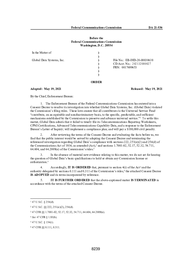 Federal Communications Commission DA 21536Before the Federal Communications Commission Washington, D.C. 20554 In the Matter of Global Data Systems, Inc.) ))))))File No.: EBIHD2000030638 CD Acct. No.: