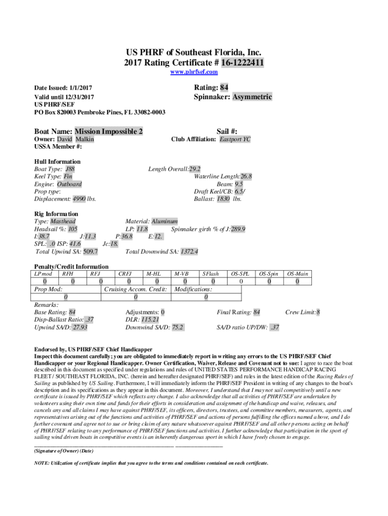 Get the free US PHRF of Southeast Florida, Inc. 2012 Rating Certificate ...