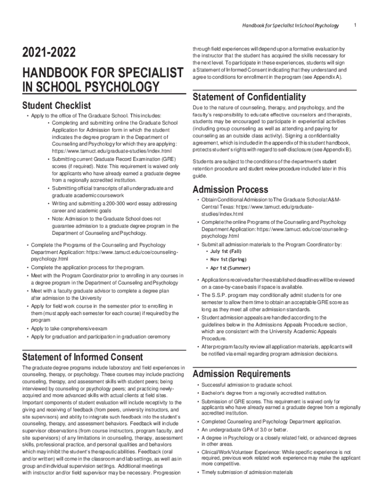 Handbook for Specialist in School Psychology20212022 HANDBOOK FOR SPECIALIST IN SCHOOL PSYCHOLOGY Student Checklist Apply to the office of The Graduate School. This includes: Completing and submitting