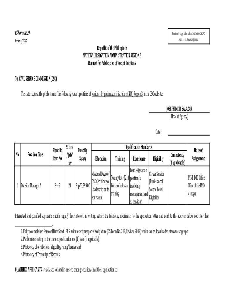 CS Form No. 9Electronic copy to be submitted to the CSC FO must be in MS Excel formatters of 2017Republic of the Philippines NATIONAL IRRIGATION ADMINISTRATION REGION 3 Request for Publication of