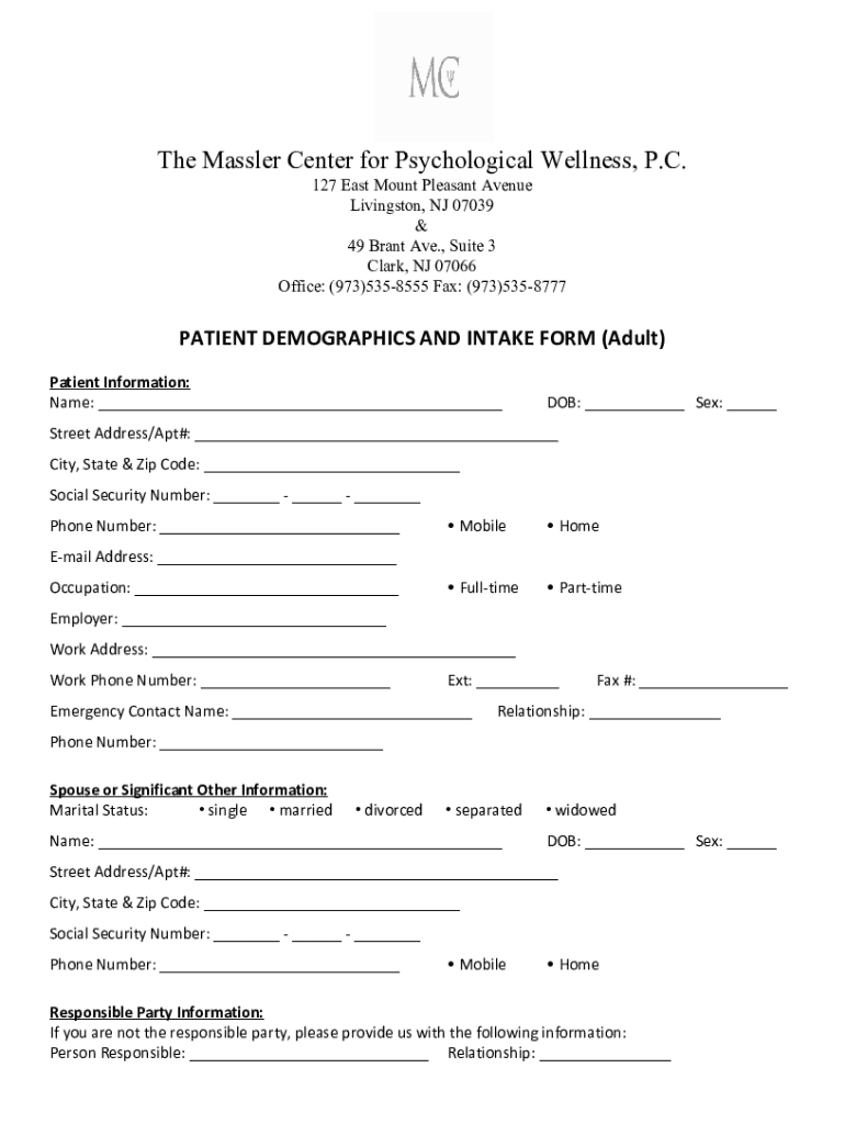 The Meissner Center for Psychological Wellness, P.C. 127 East Mount Pleasant Avenue Livingston, NJ 07039 & 49 Brant Ave., Suite 3 Clark, NJ 07066 Office: (973×5358555 Fax: (973×5358777PATIENT DEMOGRAPHICS