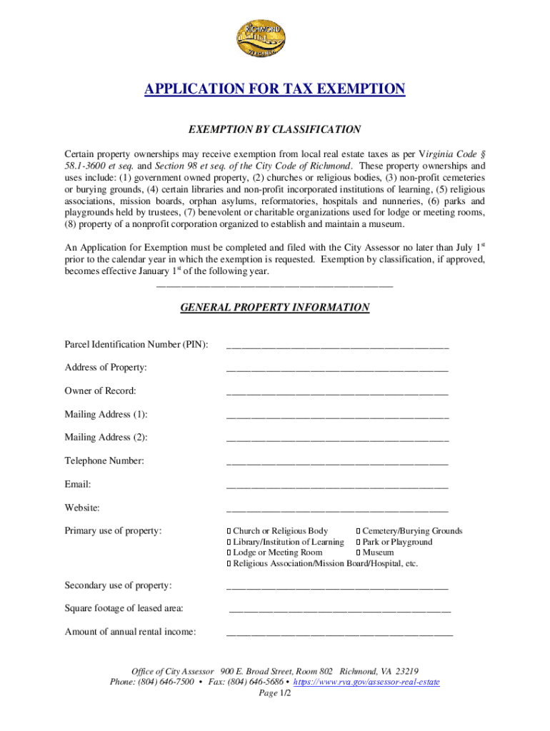 APPLICATION FOR TAX EXEMPTION BY CLASSIFICATION Certain property ownership may receive exemption from local real estate taxes as per Virginia Code 58.13600 et seq. And Section 98 et seq. Of the City