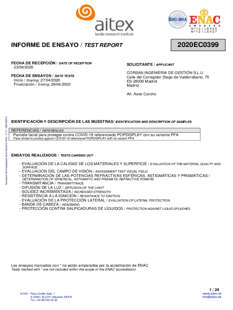 2020EC0399INFORME DE ENS AYO / TEST REPORT FEC HA DE RECEPTION / DATE OF RECEPTION 23×04/2020SOLICITANTE / APPLICANTFECHA DE ESSAYS / DATE TESTS Initio / Starting: 27×04/2020 Finalization / Ending: