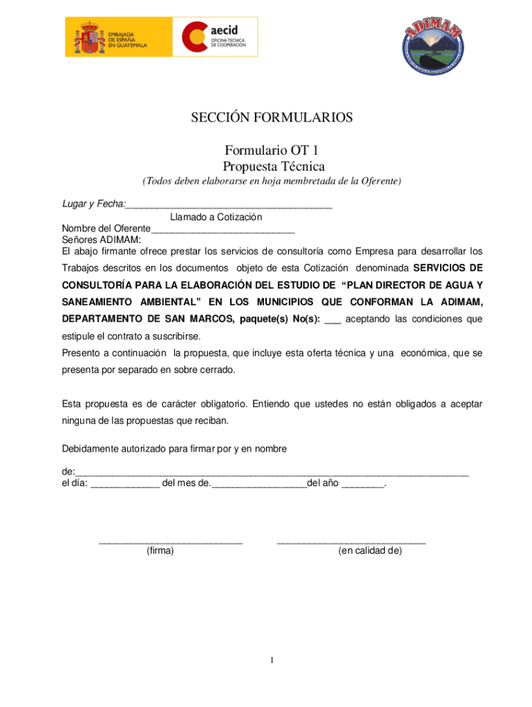 SECTION FORMULARIES Formulation OT 1 Property Tunica (To-dos Eben elaborate en hora membretada de la Faience) Lugar y Tech:___ Llama do a Cotizacin Hombre Del Faience___ Stores ADIMAC: El banjo firm
