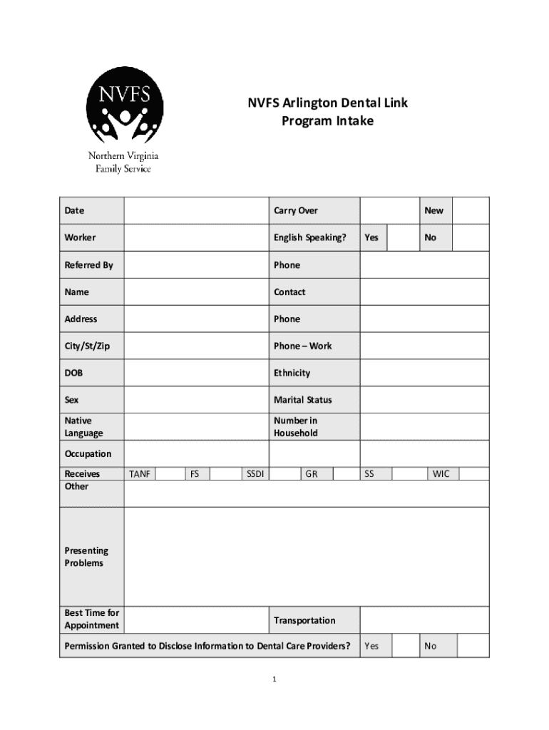NFS Arlington Dental Link Program IntakeDateCarry OverWorkerEnglish Speaking? Referred ByPhoneNameContactAddressPhoneCity×St/iPhone WorkDOBEthnicitySexMarital StatusNative LanguageNumber in Householder