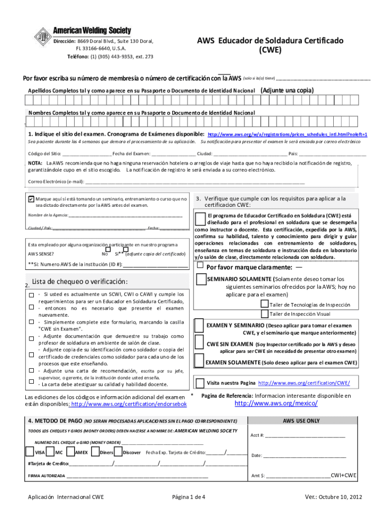 AWS Educator de Soldadura Certificate (CWE×Direction: 8669 Blvd., Suite 130, FL 331666640, U.S.A. Teflon: (1) (305× 4439353, ext. 273Por favor describe SU Nero de members o Nero de certification