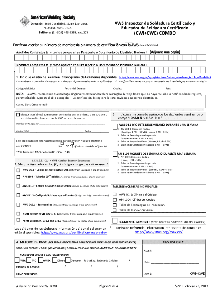 Get the free app.aws.org mexico APLICACIONCWI-CWECOMBOAWS Inspector de Soldadura Certificado y Ed...