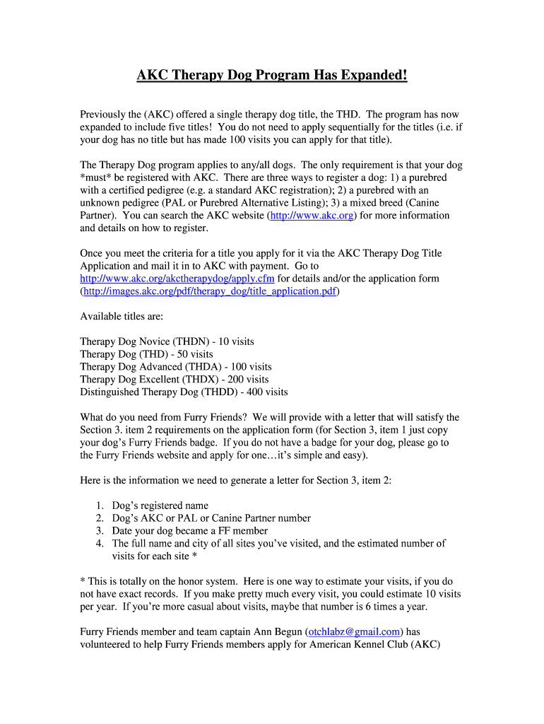 Owners of therapy dogs who have passed the AKC Therapy Dog test and completed the required number of therapy visits are required to file the AKC Formrapy Dog Program.