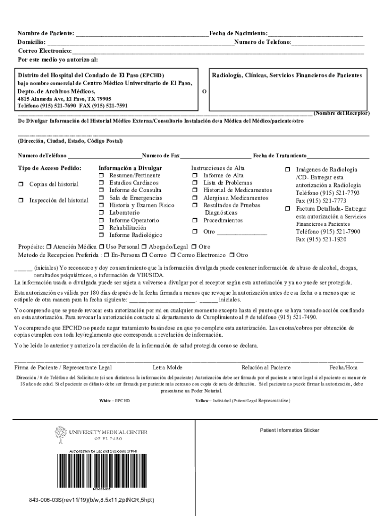 Hombre de Paciente: ___Tech de Nacimiento:___ Domicile: ___Number de Telefono:___ Core Electronic:___ POR ester media to authorize all: District Del Hospital del Condado de El Paso (EACH) banjo hombre