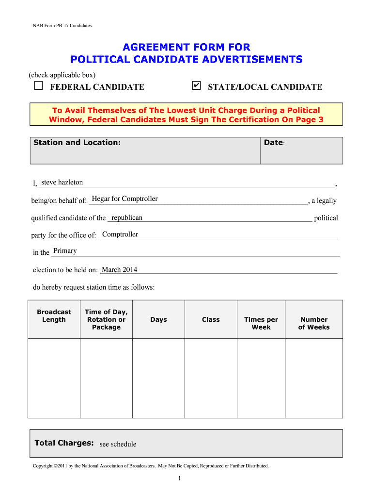 NAB Form PB17 Candidates AGREEMENT FORM FOR POLITICAL CANDIDATE ADVERTISEMENTS (check applicable box) FEDERAL CANDIDATE STATE/LOCAL CANDIDATE To Avail Themselves of The Lowest Unit Charge During a