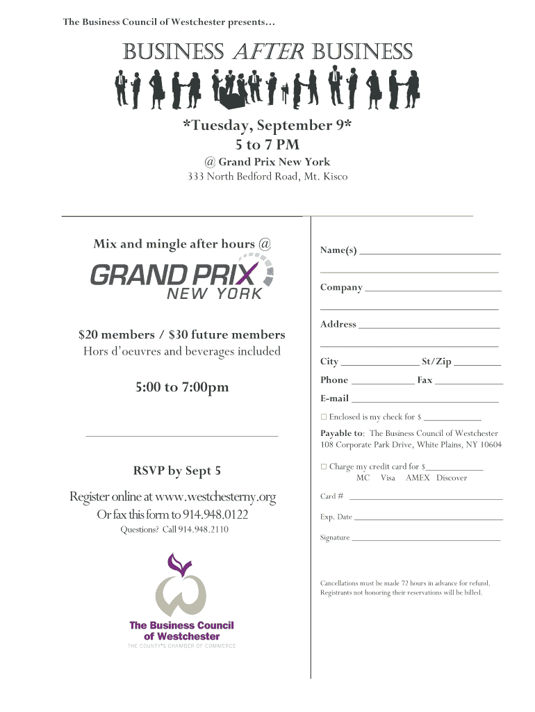 The Business Council of Westchester presents BUSINESS AFTER BUSINESS *Tuesday, September 9 5 to 7 PM Grand Prix New York 333 North Bedford Road, Mt. Disco Mix and mingle after hours Name(s) Company