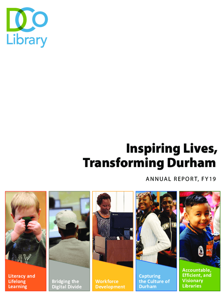 Inspiring Lives, Transforming Durham A N N U A L R E P O R T, F Y 1 9Literacy and Lifelong LearningBridging the Digital DivideWorkforce DevelopmentCapturing the Culture of DurhamAccountable, Efficient,