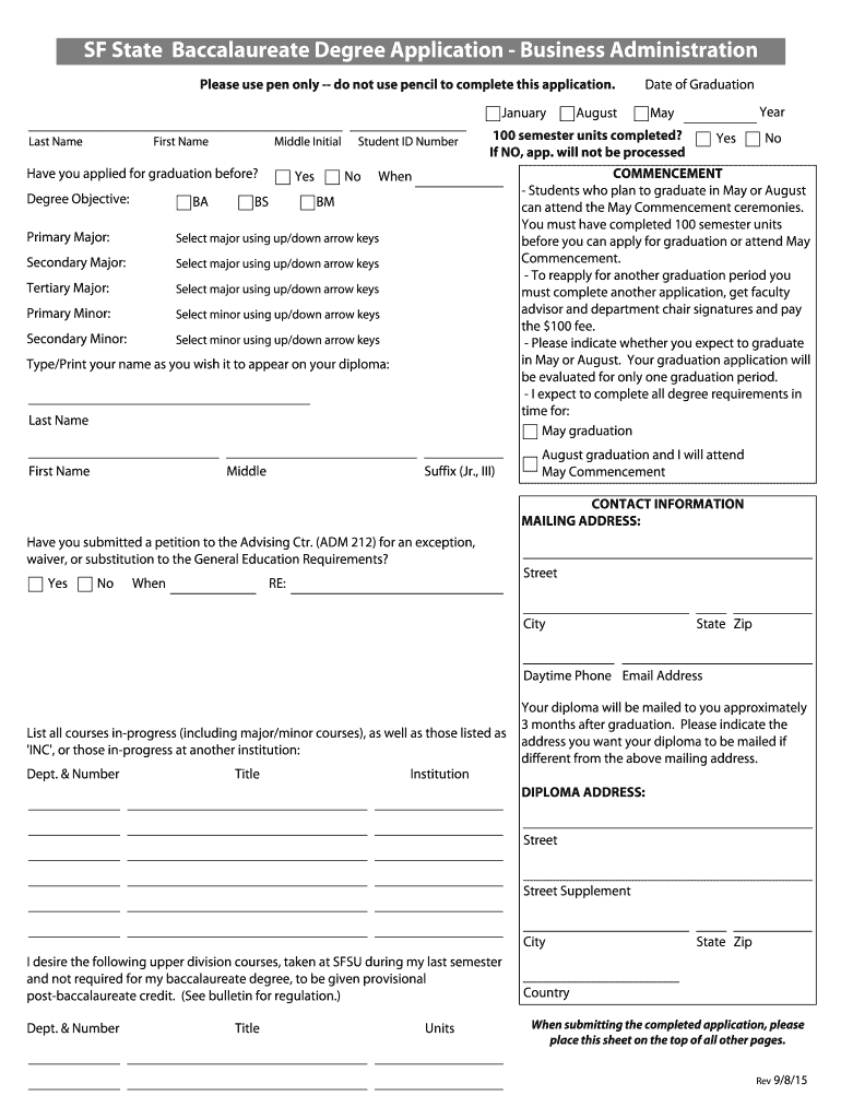 San Francisco State University Registrar's Office Application for Baccalaureate Degree Business Administration A blank copy of this form may be saved to your computer. No information previously entered