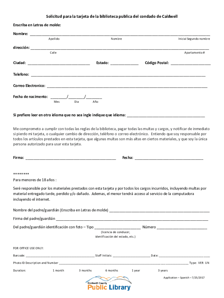 Solicited para la target DE la biblioteca public Del condado de Caldwell Inscribe en Tetras DE mode: Hombre: ___ ApellidoNombreInicial Segundo nombredireccin: ___ CalleApartamento #Ciudad: ___Est