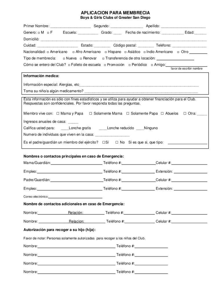 APPLICATION PARA MERCIA Boys & Girls Clubs of Greater San Diego Primer Hombre: ___ Segundo: ___ Adelaide: ___ Genera: M Rescue: ___ Grade: ___Tech de Nascimento: ___ Dad:___Domicile: ___ Ciudad: ___