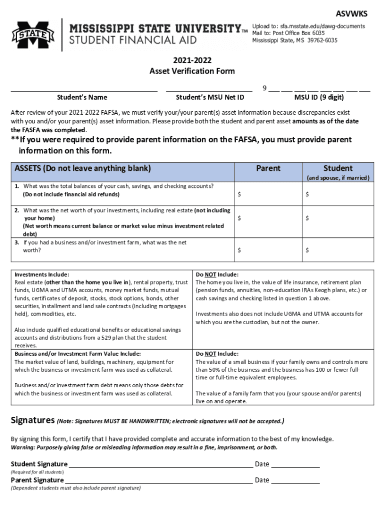 ASKS Upload to: SFA.misstate.edu×dawgdocuments Mail to: Post Office Box 6035 Mississippi State, MS 39762603520212022 Asset Verification Form ___ Students Name___ Students MSU Net ID9 ___ ___ ___