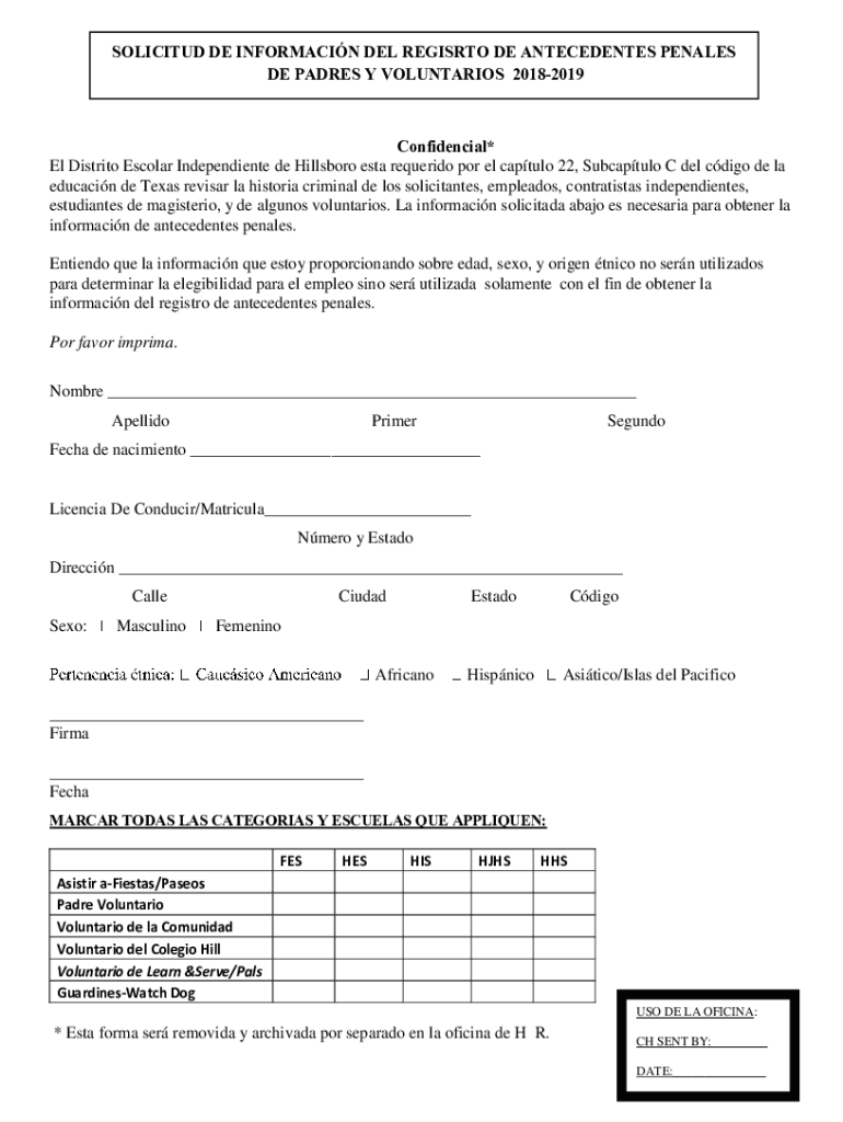 SOLICITED DE INFORMATION DEL REGISTER DE ANTECEDENTS PENAL ES DE PADRES Y VOLUNTARIES 20182019Confidencial* El District Escolar Independent de Hillsboro ESTA required PO Rel capture 22, Subcapsular