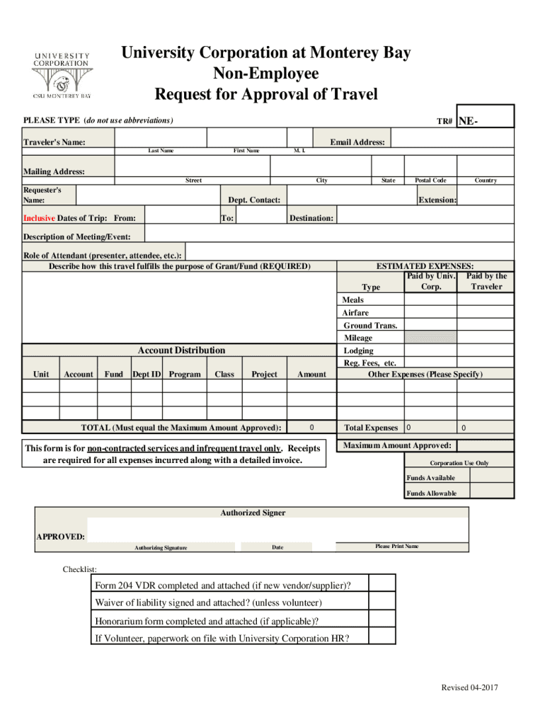 University Corporation at Monterey Bay Employee Request for Approval of Travel PLEASE TYPE (do not use abbreviations×TR#Traveler\'s Name:NEE mail Address: Last NameFirst Name. I. Mailing Address: