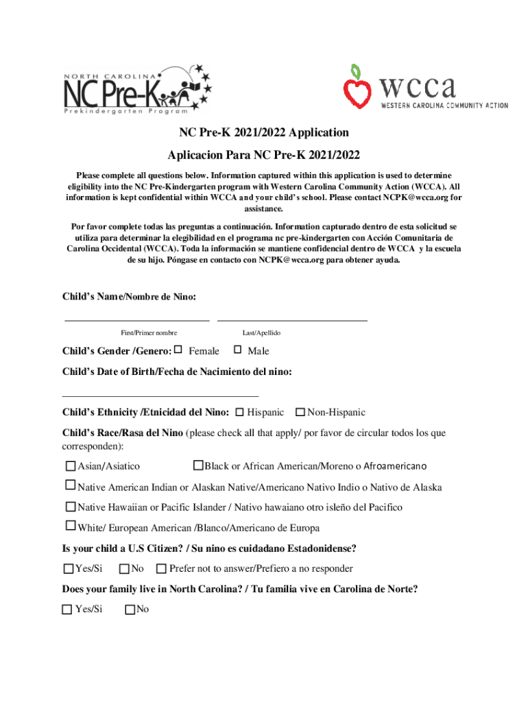 NC Prey 2021×2022 Application Para NC Prey 2021×2022 Please complete all questions below. Information captured within this application is used to determine eligibility into the NC PreKindergarten