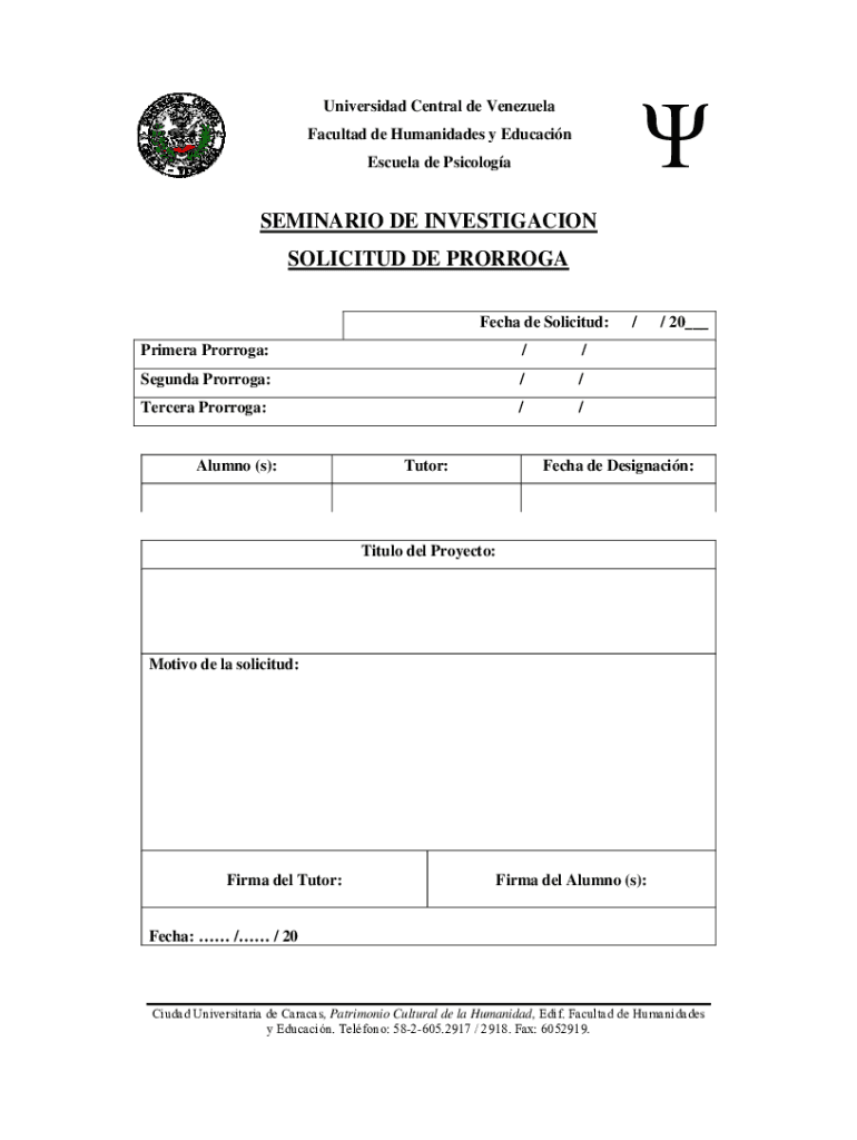 University Central de Venezuela Facultad de Humanidades y Education Estela de PsicologaSEMINARIO DE INVESTIGATION SOLICITED DE PROROGUE Tech de Solicitud: Primer Prorogue://Segundo Prorogue://Terceira