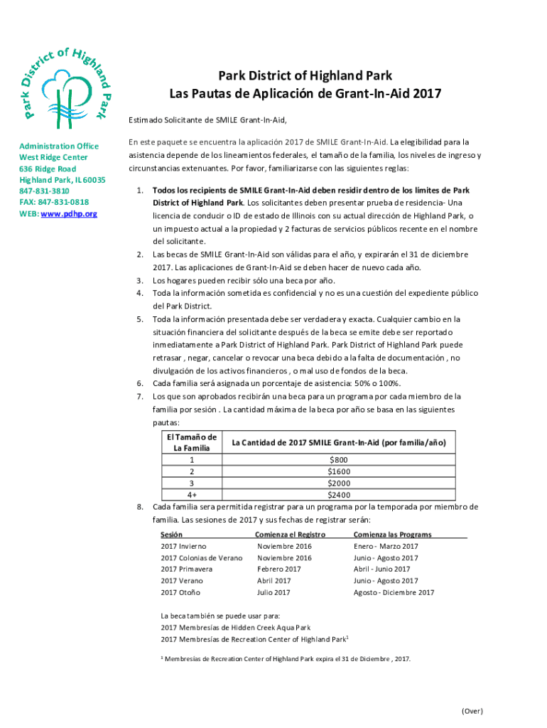 Park District of Highland Park Las Pastas de Aplicacin de GrantInAid 2017 Estimate Solicit ante DE SMILE Granting, Administration Office West Ridge Center 636 Ridge Road Highland Park, IL 60035 8478313810