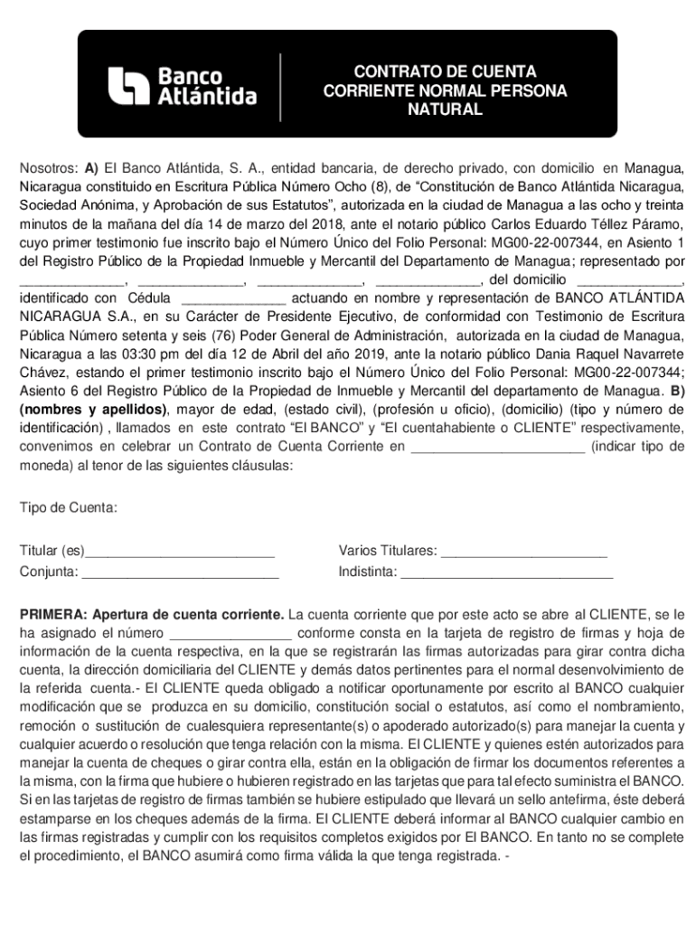 CONTRALTO DE CENT CORRINE NORMAL PERSONA NATURALNosotros: A) El Banco Atlantic, S. A., enticed Bavaria, DE each private, con domicile en Managua, Nicaragua constitute en Scripture Public Nero Echo