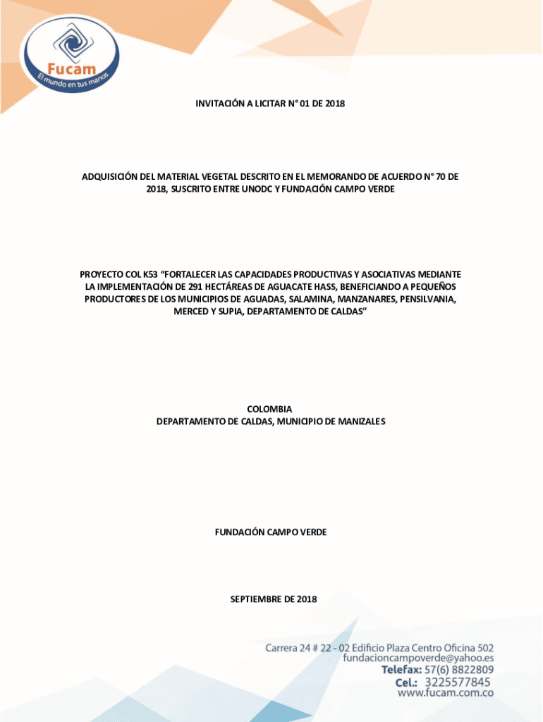 INVITATION A LICIT AR N 01 DE 2018ADQUISICIN DEL MATERIAL VEGETAL DESCRIBE EN EL MEMORANDA DE ACTED N 70 DE 2018, SUBSCRIBE ENTIRE UNODC Y FOUNDATION CAMP VERDEPROYECTO COL K53 FORTALEZA LAS CAPACITIES