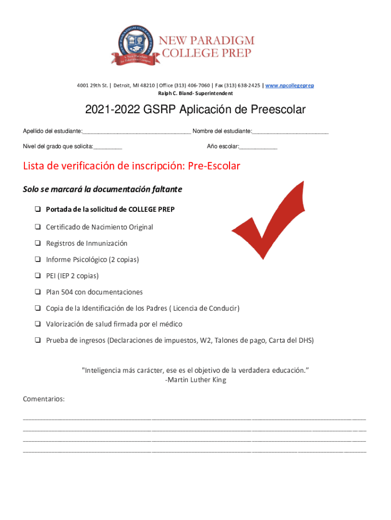 4001 29th St. | Detroit, MI 48210 |Office (313× 4067060 | Fax (313× 6382425 | www.npcollegeprep Ralph C. Bland Superintendent20212022 GRP Application de Preescolar Adelaide Del estudiante:___ Hombre