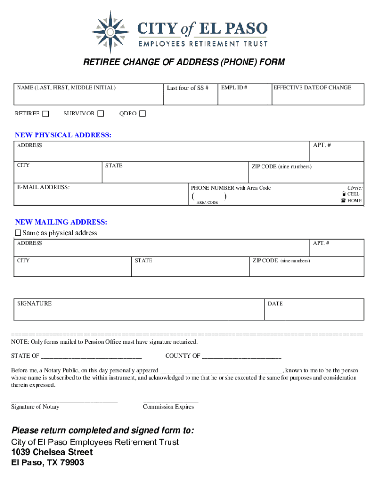 RETIREE CHANGE OF ADDRESS (PHONE) FORM NAME (LAST, FIRST, MIDDLE INITIAL×Retirees four of SS #EMIL ID #EFFECTIVE DATE OF CHANGEQDROSURVIVORNEW PHYSICAL ADDRESS: APT. #ADDRESSCITYSTATEZIP CODE (nine