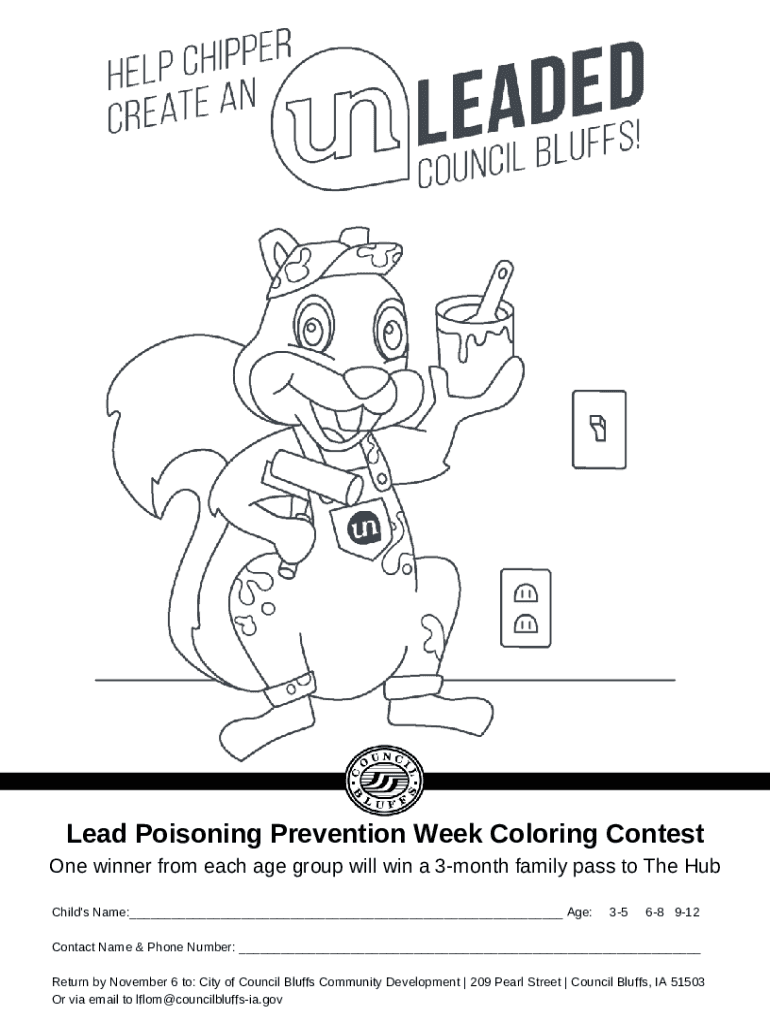 Lead Poisoning Prevention Week Coloring Contest One winner from each age group will win a 3month family pass to The Hub Child\'s Name:___ Age:3568 912Contact Name & Phone Number: ___ Return by November