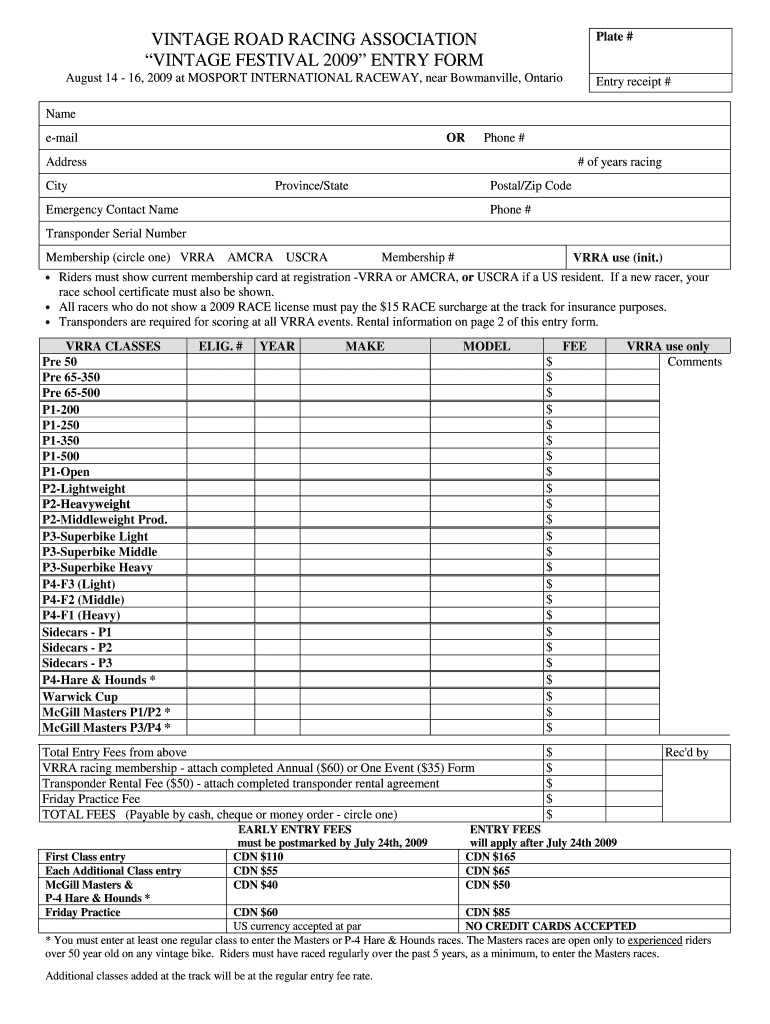 Plate # VINTAGE ROAD RACING ASSOCIATION VINTAGE FESTIVAL 2009 ENTRY FORM August 14 16, 2009 Gosport INTERNATIONAL RACEWAY, near Loganville, Ontario Entry receipt # Name e-mail OR Phone # Address #