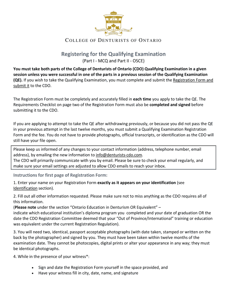 COLLEGE OF DENTISTS OF ONTARIO Registering for the Qualifying Examination (Part I MCQ and Part I — OSCE) You must take both parts of the College of Dentists of Ontario (CDO) Qualifying Examination