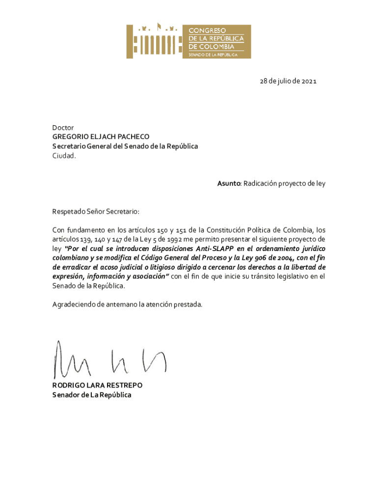 28 de Julio de 2021Doctor GREGORIO EACH PACHECO Secretary General Del Sen ad ode la Replica Ciudad. As unto: Radiation project de leyRespetado Seer Secretary: Con fundament en Los articles 150 y 151