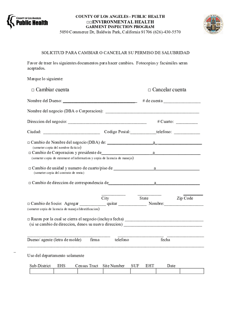 COUNTY OF LOS ANGELES PUBLIC HEALTHENVIRONMENTAL HEALTH GARMENT INSPECTION PROGRAM5050 Commerce Dr, Baldwin Park, California 91706 ×626)4305570SOLICITUD PARA CAMBIAL O CANCELER SU PERM ISO DE SALUBRIOUS