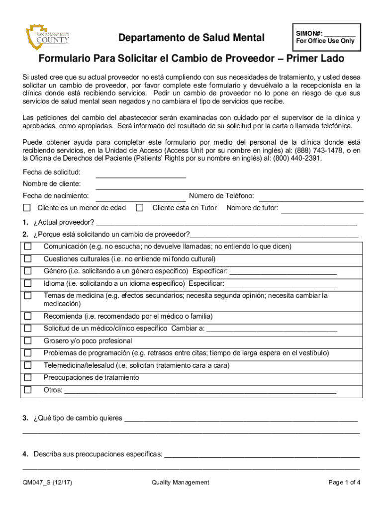 Department de Salud Mentation#: ___ For Office Use OnlyFormulario Para Solicitor el Cam bio DE Provender Primer Lady Si used Cree Que SU actual provender no est complained con SUS necessitates de