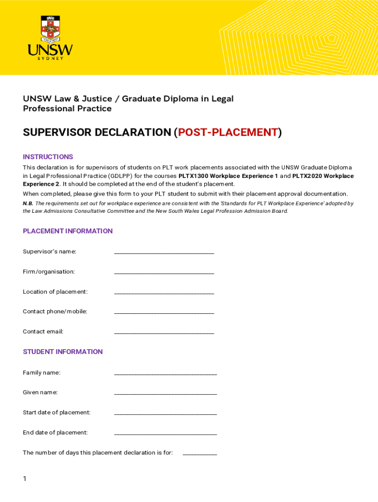 UNSW Law & Justice / Graduate Diploma in Legal Professional PracticeSUPERVISOR DECLARATION (OUTPLACEMENT) INSTRUCTIONS This declaration is for supervisors of students on PLT work placements associated