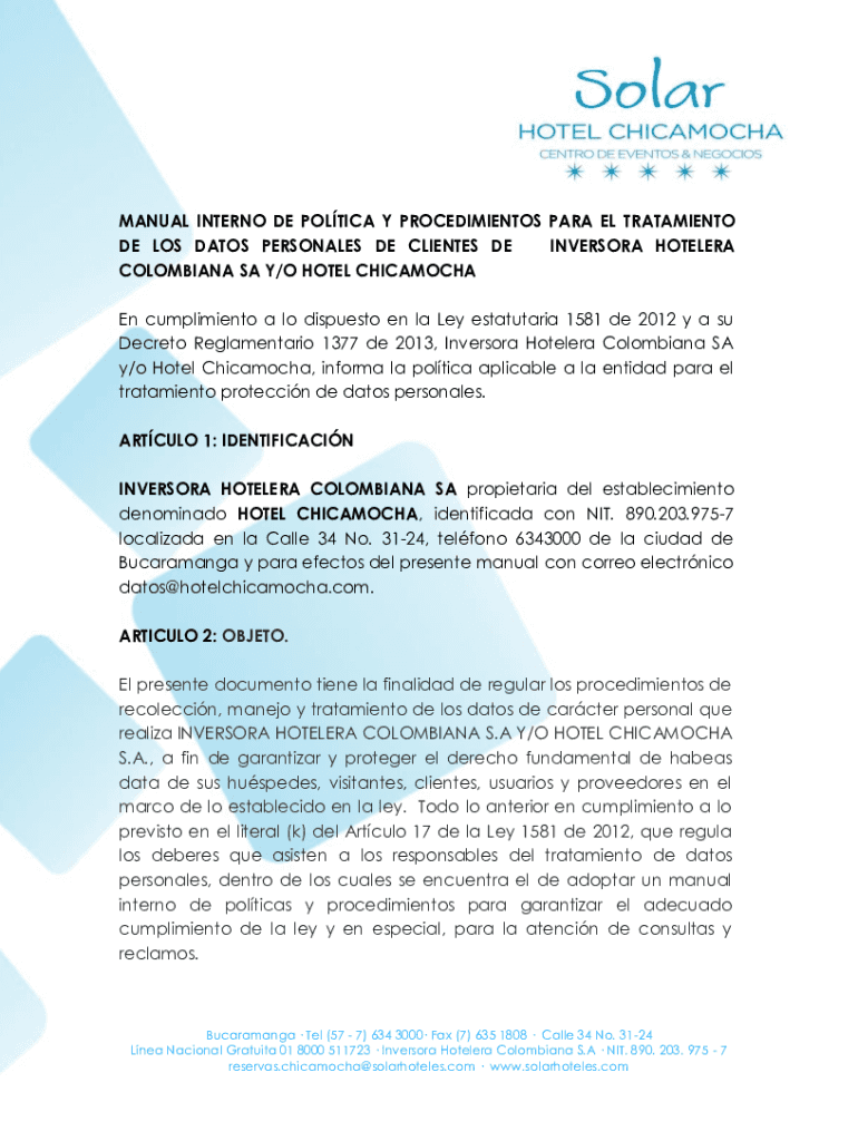 MANUAL INTERN ODE POLITICAL Y PROCEDIMIENTOS PARA EL TRATAMIENTO DE LOS DATES PERSONAGES DE CLIENTS DE INTERIOR HOTEL ERA COLOMBIAN SA Y×O HOTEL CHICAMOCHA En compliment a lo dispute en la La estatutaria
